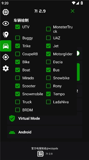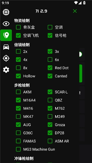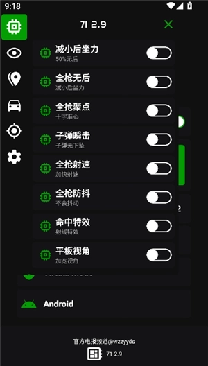 3、轻点左上角的悬浮窗口,即可打开修改功能列表,其中涵盖载具、枪械、画质等诸多修改项目。
