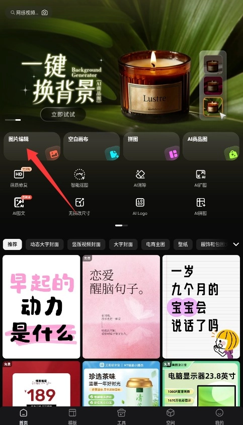3、进入应用首页选择"图片编辑"功能,从手机相册导入需要修改的图片即可开始创作。