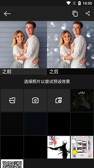 2、点击一种特效,这儿就能看到模板之后的效果,并在此选择照片以尝试预设效果