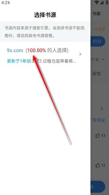 6、在显示的书源中选择一个切换即可,点击右上角的【刷新】还可以查看有没有其他新书源。