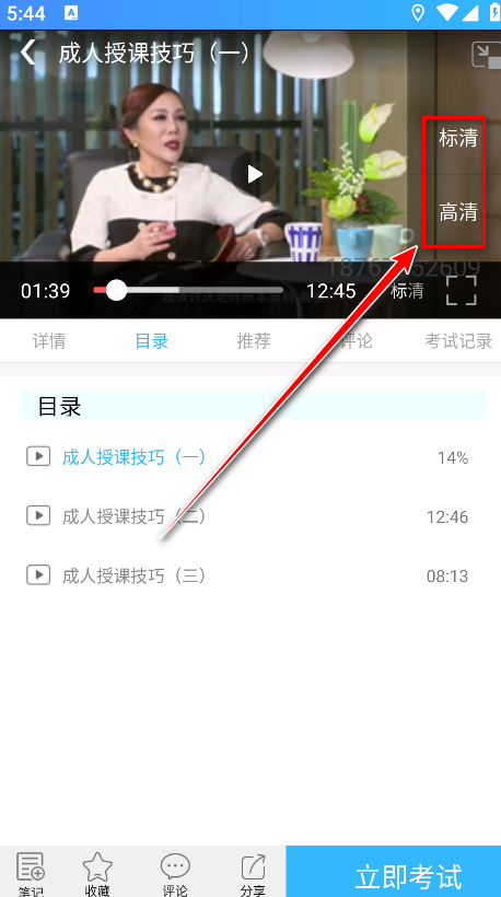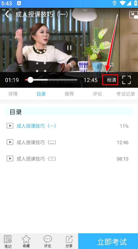 3. 如以下图片所示,即可观看视频,点击标清选项。