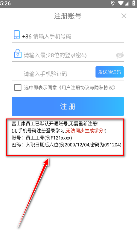 5. 若为富士康员工,账号已默认开通,无需重新注册。请认真阅读并牢记下方红色框内的内容。