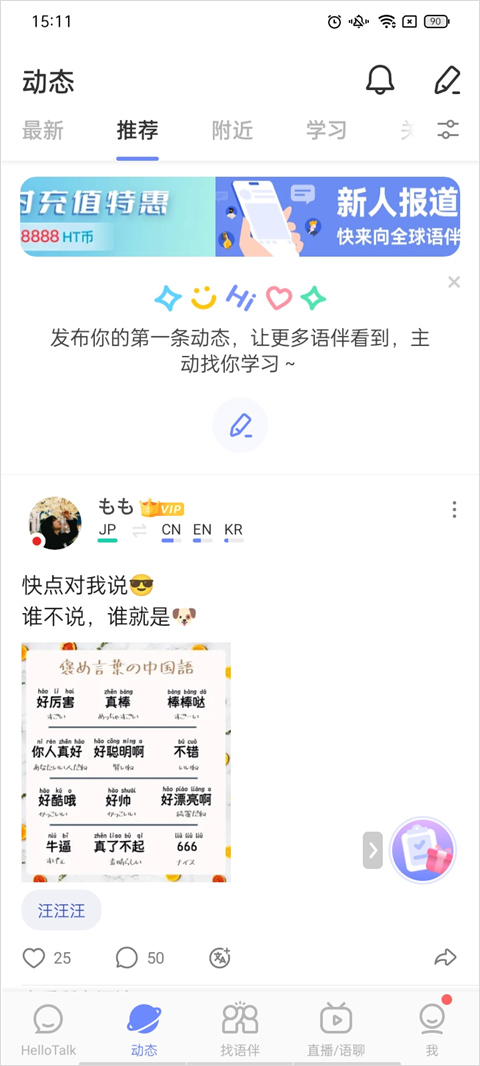 7、此外,在动态中还可以查看其他用户的语言学习情况。