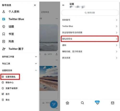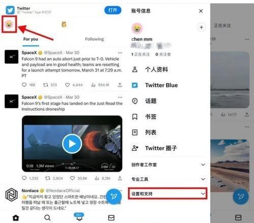 1、首先Twitter,找到界面右上角自己的头像点击进入,找到并点击“设置和支持”。