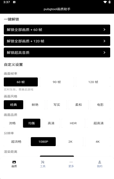 PUBGTool画质助手能够通过“一键解锁”以及自定义设置达成画质优化。