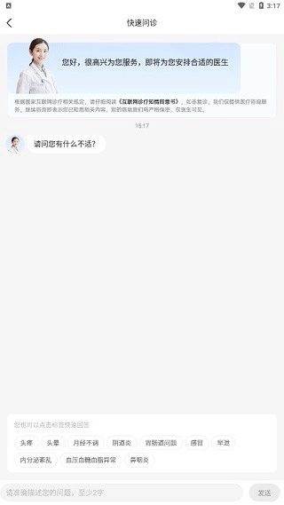 2、以“快速问诊”为例,在此处你既能详细描述自身症状,也能够通过点击标签实现快速作答。