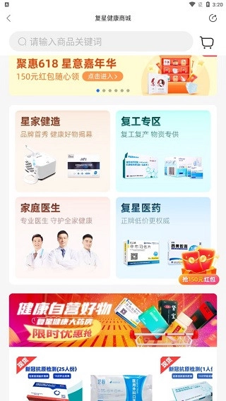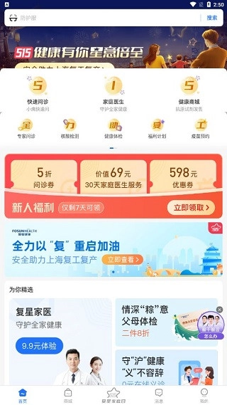 1、于“复星健康”首页,既能进行在线问诊,还能在健康商城选购全网低价药品。