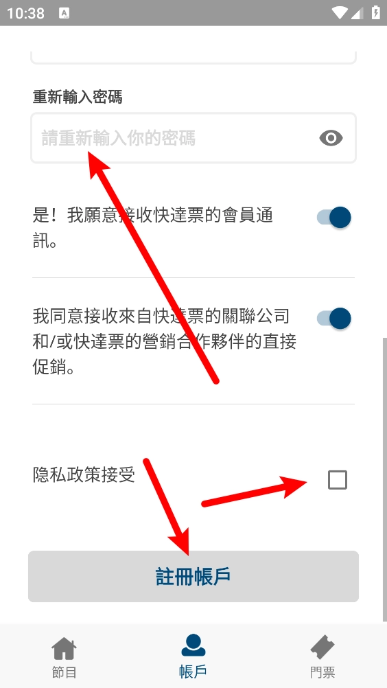 5、向下滑动输入密码,勾选相关隐私政策后,点击底部"注册账户"即可。