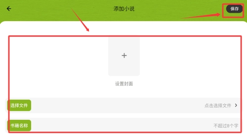 4、先点击中间的加号设置封面再选择左下角的文件还有书籍名称然后点击右上角的保存即可。