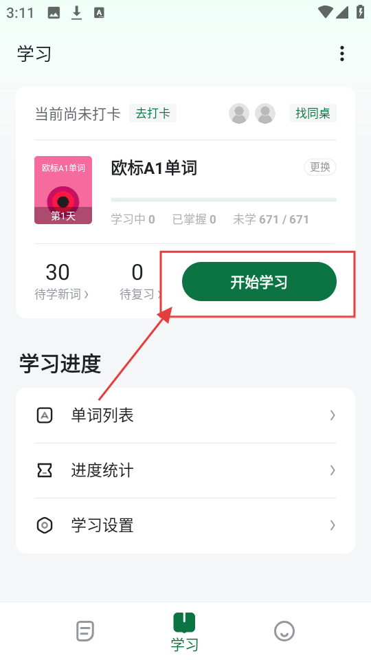 选好课本后,返回学习页面,点击【开始学习】按钮,就能进入单词学习界面开始学习啦。