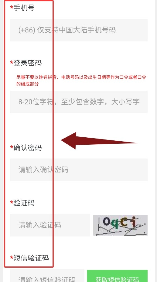 4、最后填写手机号、登录密码、验证码以及短信验证码,即可完成注册流程。
