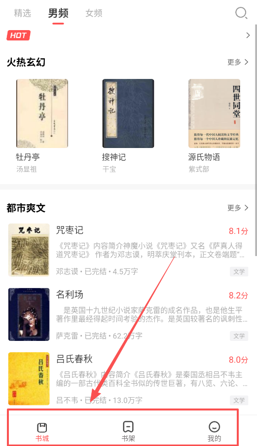 打开软件后,首先查看底部区域,这里设有“书城”“书架”“我的”三个页签,系统默认显示的是书城页面,该页面内部分为男频、女频以及热门分类板块。