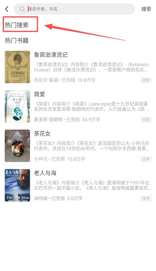 想找热门好书的话,就去“热门搜索”板块看看吧,那里收录了《老人与海》《鲁宾逊漂流记》这类经典作品,点击进去还能查看书籍的内容简介和字数信息。