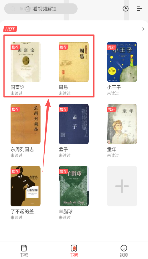 3、碰到标注着“未读过”的书籍,比如《国富论》《周易》这类,点击一下就会弹出“看视频解锁”的提示,一般看个几十秒的广告就能免费阅读全书内容了。