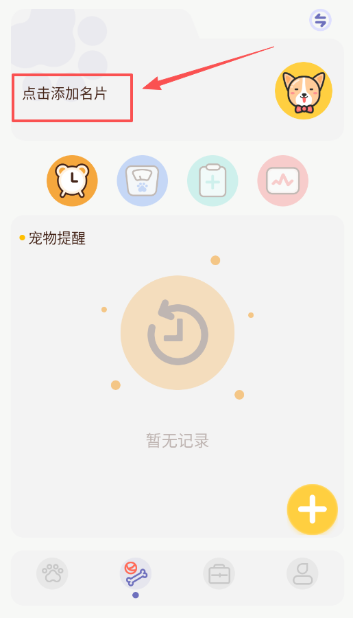 二、名片管理与提醒设置。在主界面点击添加宠物名片,即可记录爱宠的相关信息。