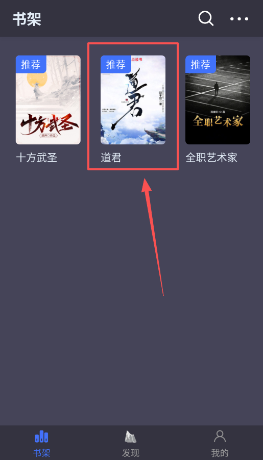1、核心操作围绕底部导航栏进行,书架页面收纳着你已收藏的《全职艺术家》《道君》等作品,便于你随时切换查找想阅读的内容。