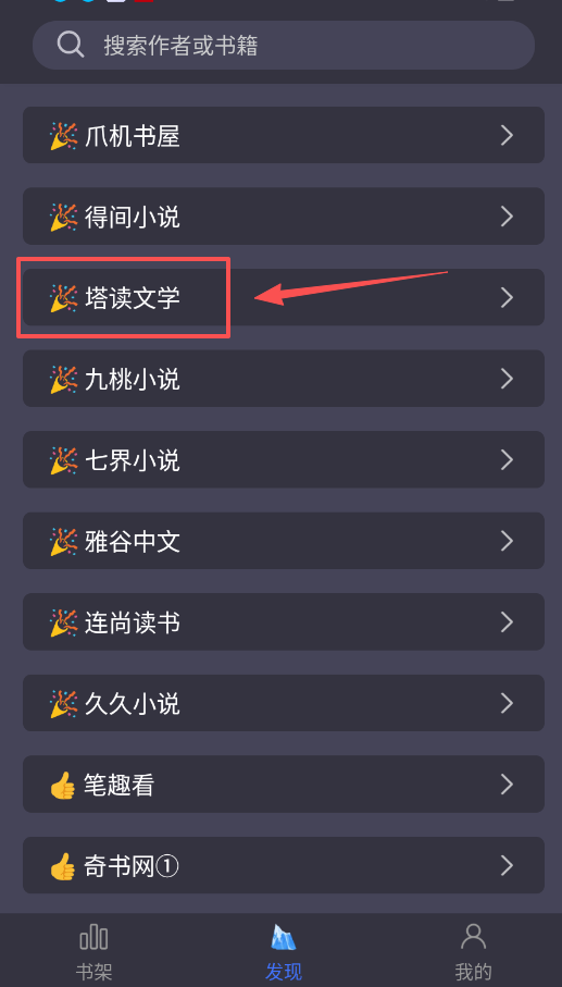 搜索功能是查找书籍的核心方式,输入书名后会显示爪机书屋、塔读文学等多个书源选择,如此可以确保后续章节能够及时阅读。