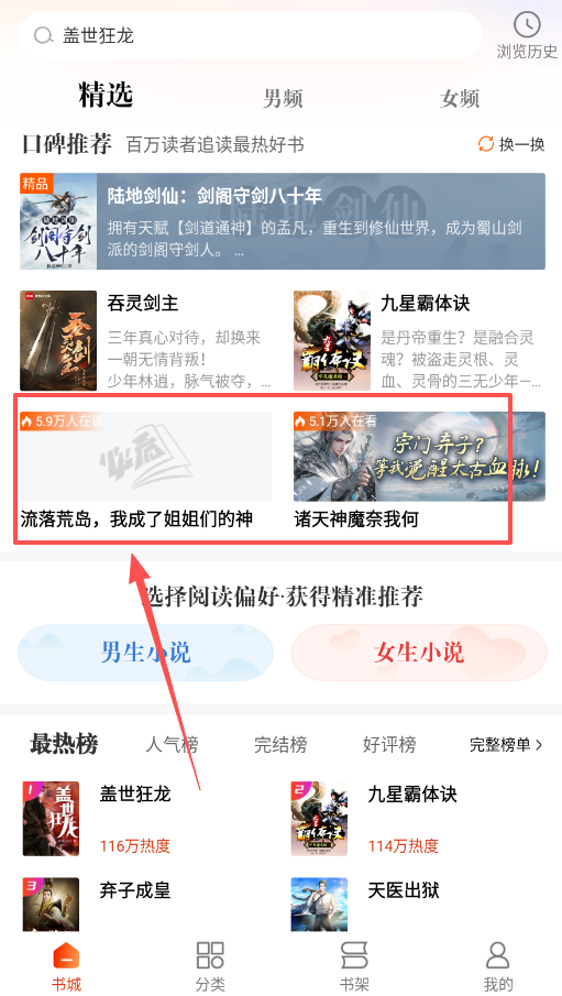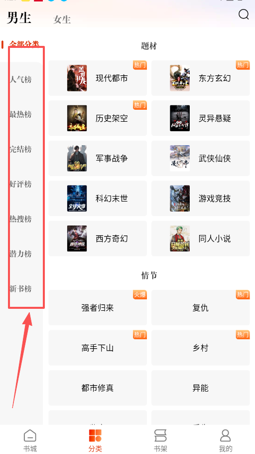 2、点击底部书城进入选书大厅,这里提供男生女生两种视角切换,还有人气榜、完结榜等多种榜单以及详细的分类标签。