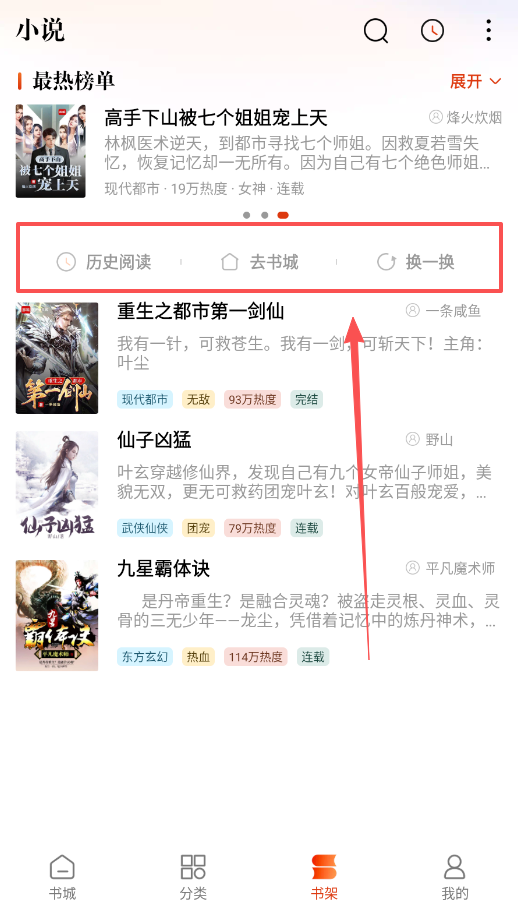 4、日常使用中,书架是你追读小说的管理中心,分类页则提供热门书单和换一换等推荐板块,让你持续发现有趣的新故事。