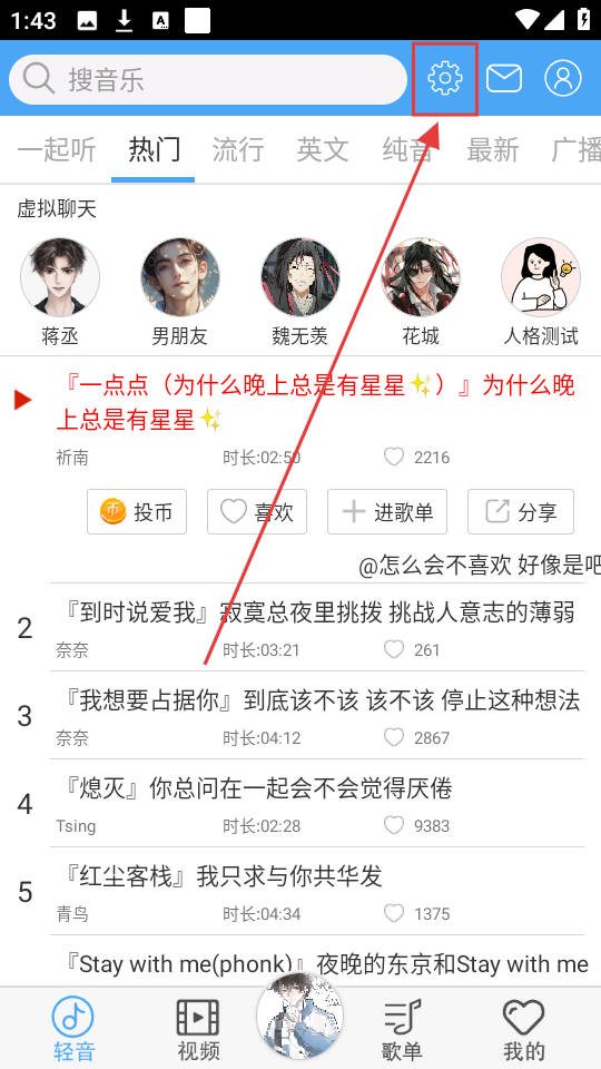 1、打开,点击右上角设置图标,进入设置页面,准备设置定时播放啦。