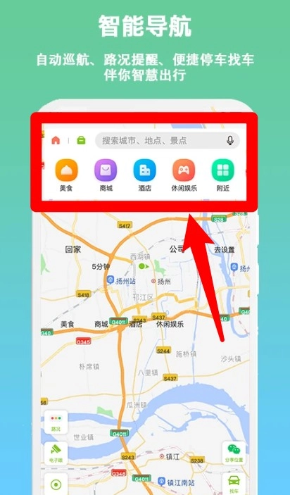 2、智能导航首页整合了美食、酒店、商圈、休闲娱乐等各类地点的搜索入口,同时具备智慧出行路径规划功能。