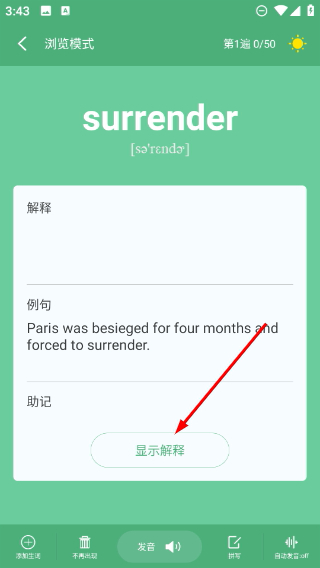 2、进入浏览模式页面后,点击【显示解释】按钮,就能查看当前单词(例如surrender)的详细释义和例句等相关内容。
