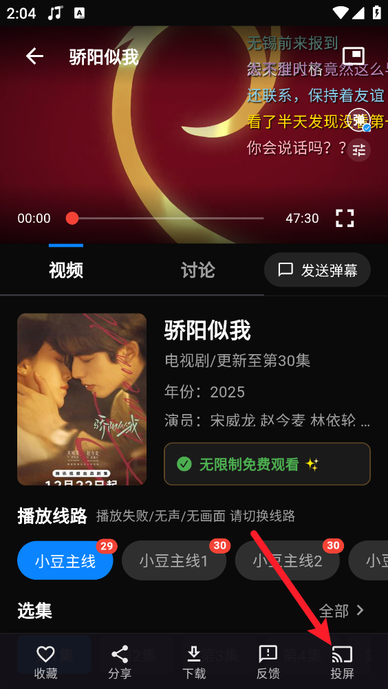 3、进入播放页面,点击右下角"投屏"。
