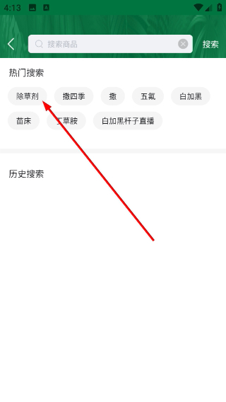 2、进入搜索界面后,选择热门搜索里的“除草剂”选项,就能快速查找相关农资商品,得到产品列表。