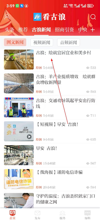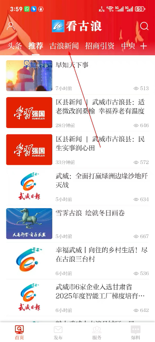 1、打开看古浪首页,点击古浪新闻选项,切换到古浪新闻板块,可查看当地相关的各类新闻内容。