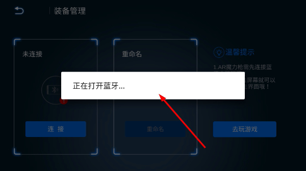3、点击连接后,页面会弹出【正在打开蓝牙...】的提示,稍作等待让蓝牙开启并完成设备配对,这样就能成功连接AR魔力枪了。