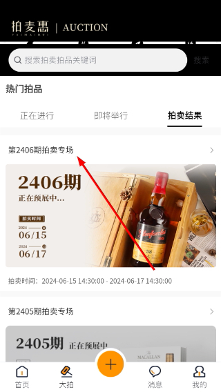3、进入拍卖结果页面后,找到目标专场(例如第2406期),点击对应的专场卡片,即可进入该拍卖专场的详情页面。