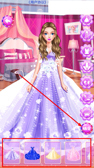 3、进入装扮界面后,点击底部陈列的各类礼服款式(像蓝色、黄色等不同选择),就能为角色更换礼服造型,让装扮效果更加多样。