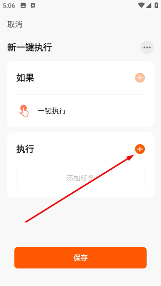 3、进入新一键执行界面后,点击“执行”栏中的“+”按钮,即可打开任务类型选择菜单,进而添加具体的执行任务。