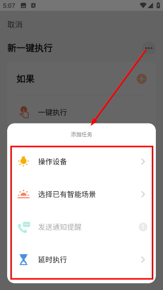 4、在任务选择菜单中,能够挑选“操作设备”“发送通知提醒”等任务类型,对场景的具体执行动作进行配置。