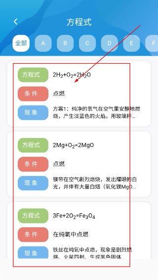 3、进入【方程式】页面后,不仅可以查看各类化学反应方程式,还能了解每个反应对应的条件、现象等相关信息。