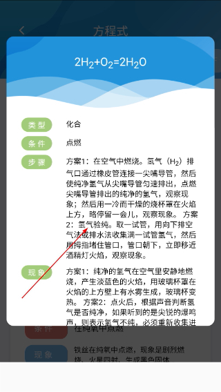 4、点击具体的化学方程式(例如\(2H_2+O_2=2H_2O\)),即可进入详情页面,查看该化学反应的类型、发生条件、操作步骤以及实验现象等详细信息。