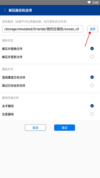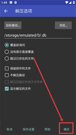3、在解压选项界面确认好目标路径及相关设置后,点击【确定】按钮,即可启动压缩包的解压流程。