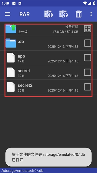 1、先在RAR文件列表里定位到你要处理的目标压缩包,比如后缀是.db.rar的那种,接着就可以准备开始解压了,这可是完成后面操作的前提呢。