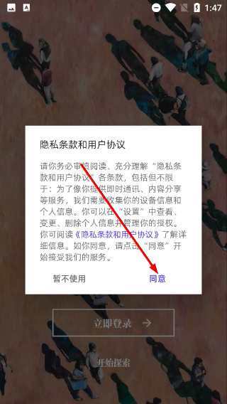 1、当【隐私条款和用户协议】的窗口弹出后,点击窗口里的【同意】按钮,就能确认接受这些协议,进而继续使用该平台提供的服务。