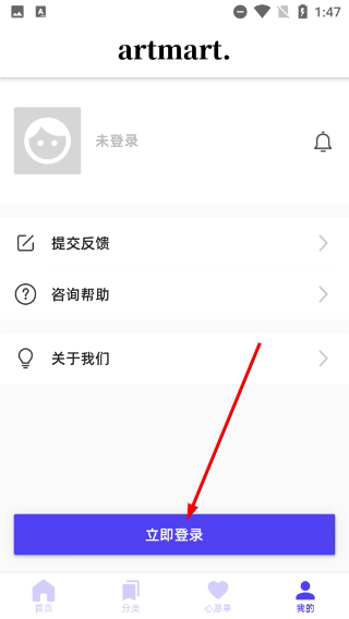 2、进入【artmart.】的个人中心页面后,点击底部的【立即登录】按钮,即可进入账号登录流程,进而完成账号验证操作。
