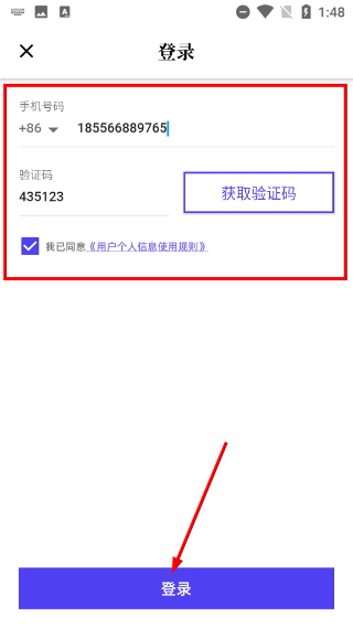 3、在登录界面填写【手机号码】,获取并输入【验证码】,勾选相关协议后点击【登录】按钮,即可完成账号登录操作。