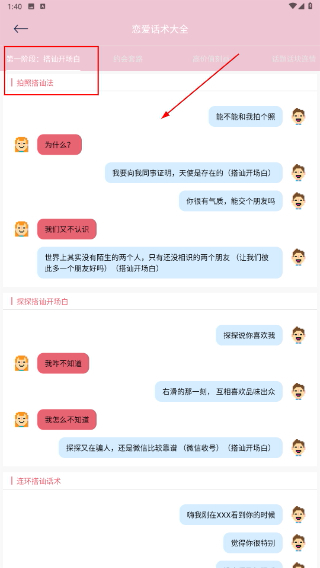 1、在主界面找到并点击【恋爱话术】入口,进入对应的内容模块,此模块包含多种情感交流场景的话术示例,可供用户参考使用。