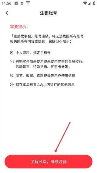4、在注销提示页面点击【了解风险,继续注销】按钮,即可完成账号注销操作。
