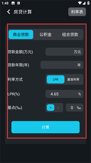 2、进入工具页面后,选择【房贷计算】选项,即可进入房贷计算的参数设置界面,接下来就可以填写贷款信息了。