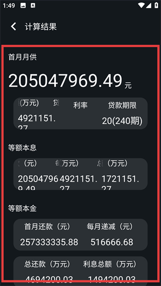 4、计算结束后会呈现结果,可查看首月月供、等额本息等数据,便于了解房贷还款情况。