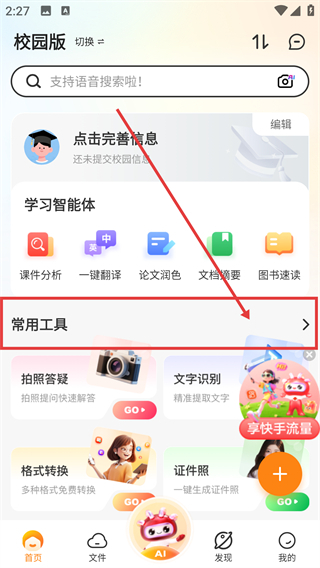 1、在首页点击【常用工具】选项,即可进入工具箱界面,之后就能找到各类实用工具进行使用了。