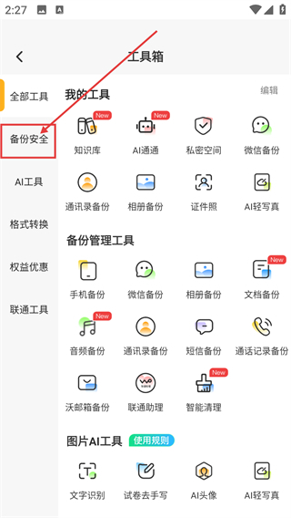 2、进入工具箱后,选择左侧的【备份安全】分类,即可看到备份相关的工具列表,便于查找对应的功能。