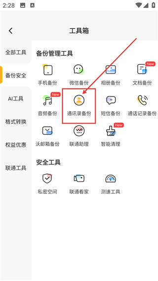 3、在备份工具列表中点击【通讯录备份】选项,即可进入通讯录的备份管理界面。