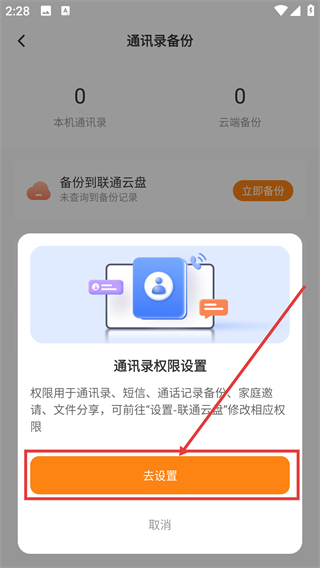 4、进入通讯录备份页面后,点击【去设置】按钮,即可配置通讯录权限,为后续的备份操作做好准备。