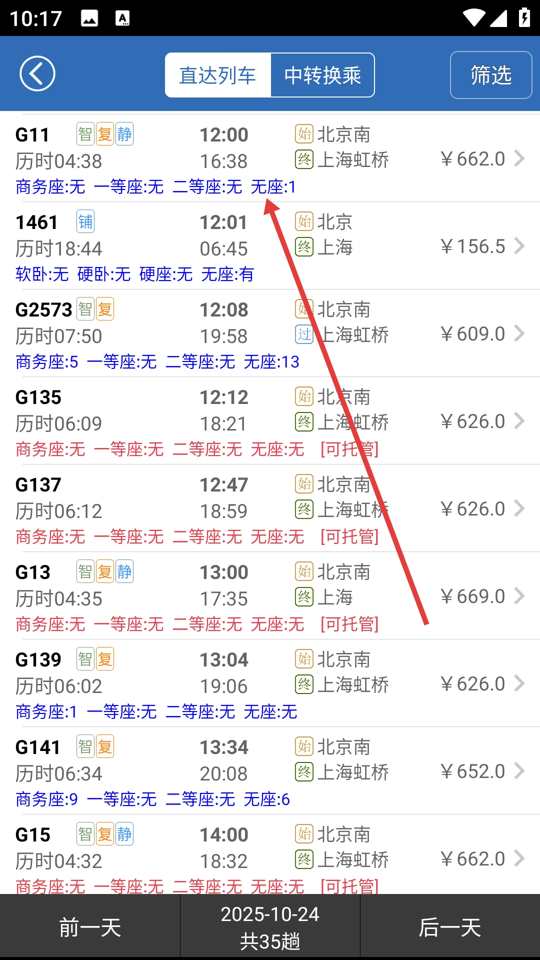 3、在列车列表里找到并选中目标列车(例如G11次列车),随后进入该列车的详情页面。